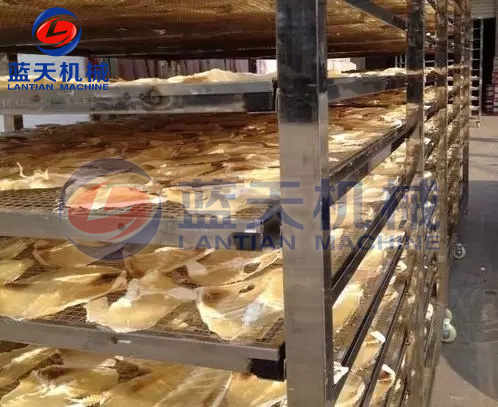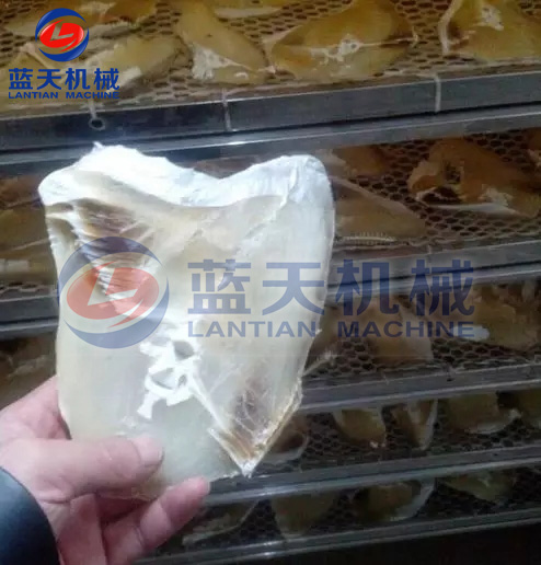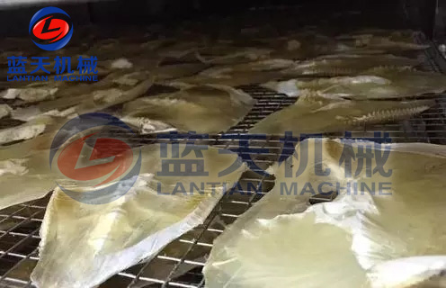 4、烘干:將魚體洗刷一次,除去沾染的污物,滴干水后,排放于特制的烘干盤上。推進(jìn)熱泵烘干房,開啟主機(jī)的控制面板進(jìn)行烘干,烘干過程由電腦版全自動控制,無需人工值守,一般海魚的烘干時間在22——28個小時左右。