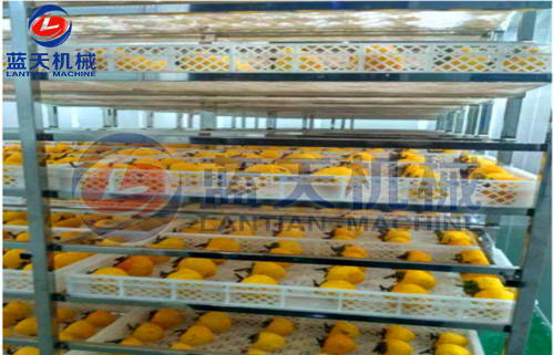 4:第一次烘烤 柿果進入柿餅烘干機后,迅速升溫至40——50°c,使柿果內(nèi)乙醇脫氫酶活性處于最高狀態(tài)。內(nèi)呼吸也加強,借以快速完成軟化,脫澀和部分脫水(25%左右),持續(xù)時間約12h,視柿果大小,成熟度靈活掌握。干燥柿餅時,防霉十分關鍵,稍有不慎,即會在幾個小時內(nèi)造成整個烤房中的柿果霉爛損失。因此,需要使烤房內(nèi)的相對濕度始中保持在70%以下,可有效防止柿果霉變。