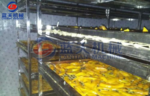 2:芒果烘干前期需要經(jīng)過清洗,去皮,切片,烘干,抽真空包裝幾個(gè)程序,今天我們注意介紹烘干過程的溫濕度控制技巧,芒果片烘干的量一般比較大,兩臺(tái)12P主機(jī)構(gòu)成的烘干系統(tǒng),每批次可以處理2.5噸的新鮮芒果片,耗時(shí)30小時(shí)完成一批次干燥,系統(tǒng)時(shí)間分為5段完成,第一段55度,升溫,3小時(shí),第二段60度,開始排濕,第三段62度,連續(xù)排濕,第四段58度,開始降溫排濕,最后一段55度,排濕鞏固。