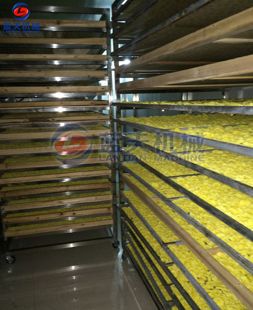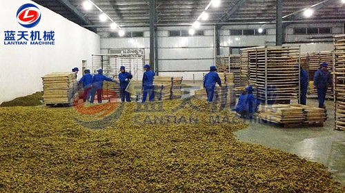 第三步——烘干,將烘車推入烘房,關(guān)閉烘房門(mén),打開(kāi)烘干機(jī)電源。這里以藍(lán)天機(jī)械烘干機(jī)為例設(shè)置烘干參數(shù),第一段8小時(shí),溫度45℃,第二段8小時(shí),溫度50度,第三段6小時(shí),溫度55度。設(shè)置完畢,返回初始界面,點(diǎn)擊開(kāi)機(jī)即可。設(shè)備會(huì)自動(dòng)運(yùn)行,注意每隔8小時(shí)要觀察一下金絲皇菊烘干情況。待烘房濕度降至13%左右即可出爐。