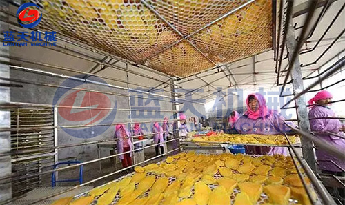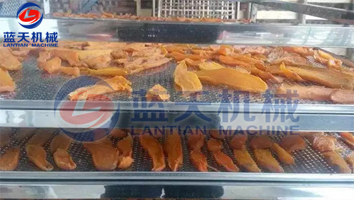 1、待紅薯片烘干機溫度升至大約30℃時將紅薯片放入烘房內(nèi)部。設(shè)定溫度為40℃。烘干時間為1-2小時。