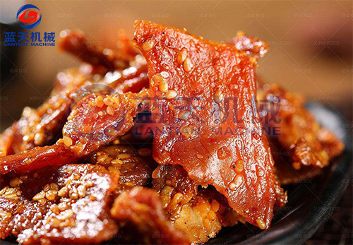 將出鍋的肉塊,置于不銹鋼網(wǎng)盤中或吊掛于烘烤推車上,然后推進(jìn)烘房內(nèi)烘烤,溫度為45-60℃,烘烤時(shí)間為3-4小時(shí),即為豬肉干。