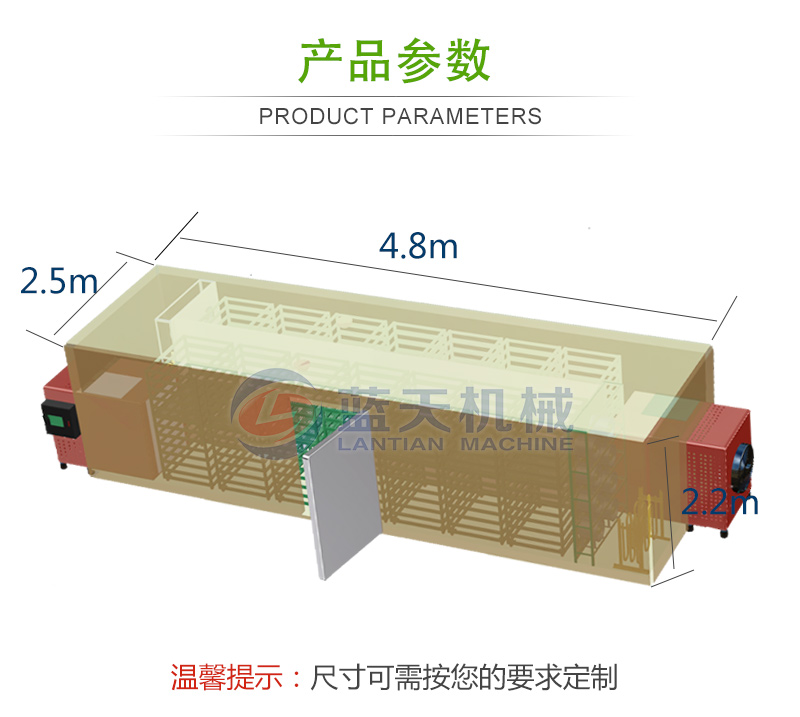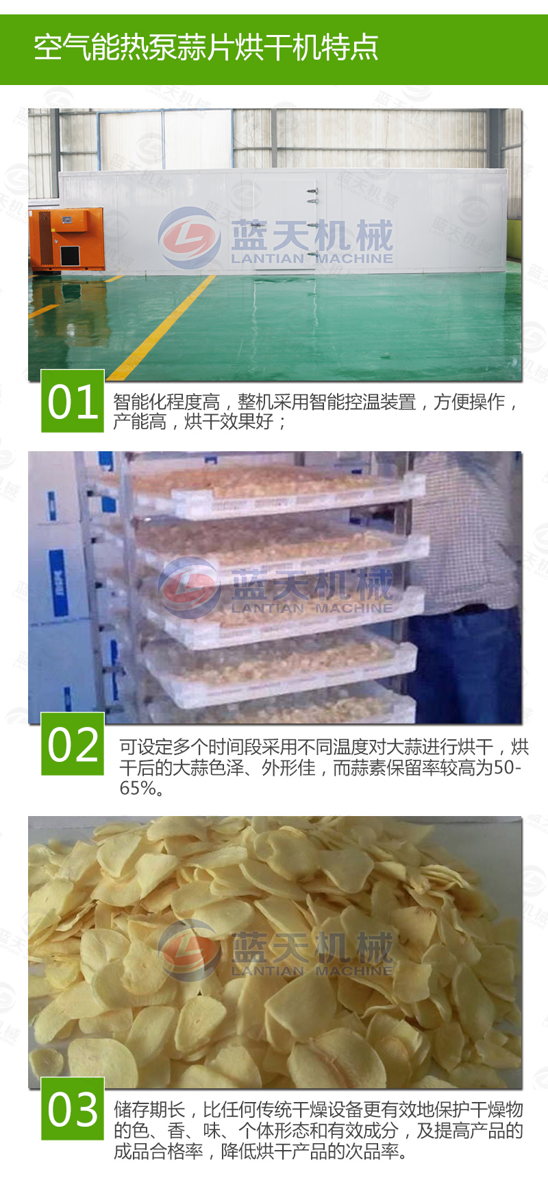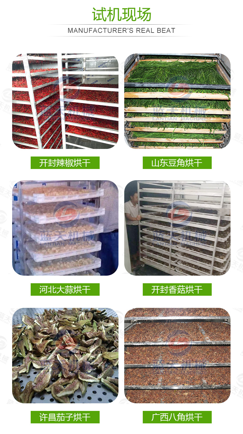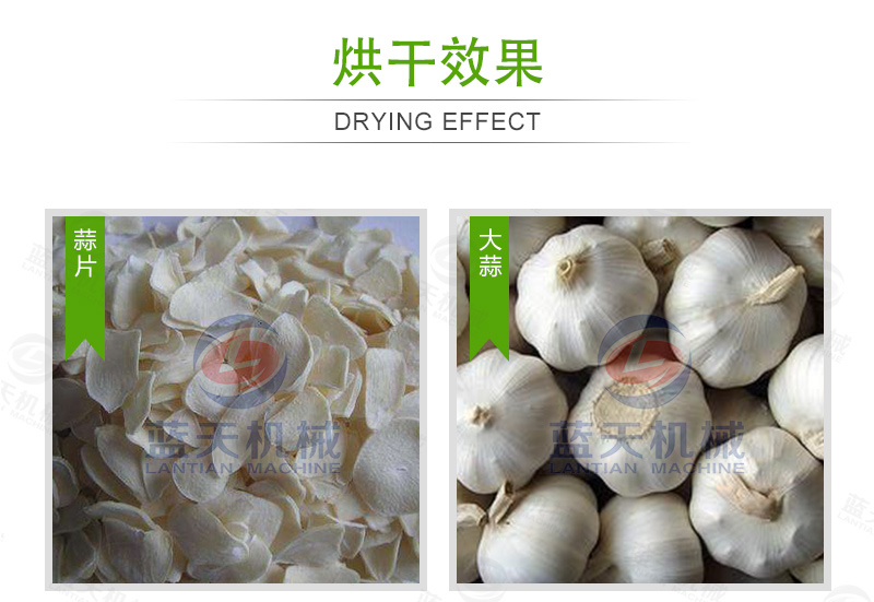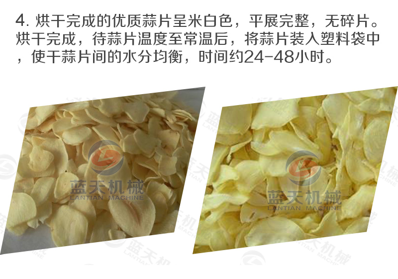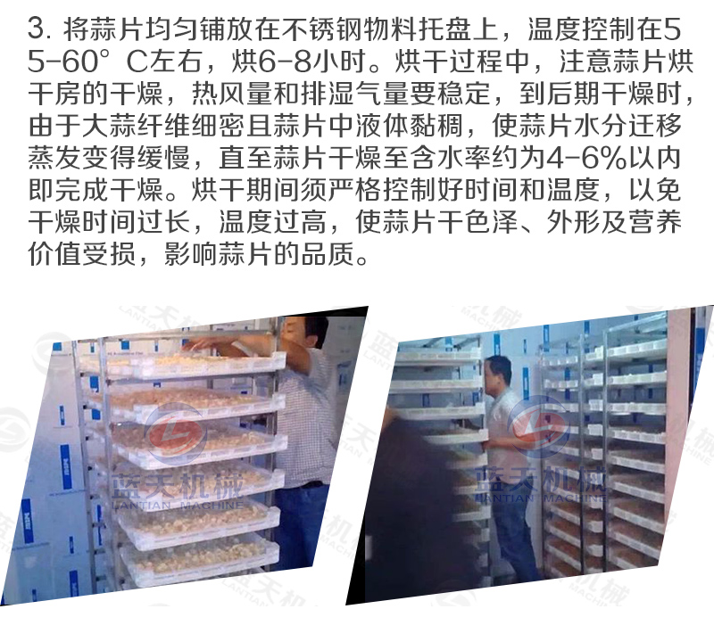 11、把蒜片均勻的鋪在蒜片烘干機(jī)設(shè)備的網(wǎng)格盤(pán)內(nèi),將網(wǎng)格盤(pán)插入物料車,將物料車推進(jìn)烘干內(nèi)。蒜片烘干過(guò)程中,溫度應(yīng)控制在55~75 ℃之間,烘干時(shí)間為10~12小時(shí)。烘干后的蒜片標(biāo)準(zhǔn)為:片形正常、色澤凈白,水分含量為4~5%。