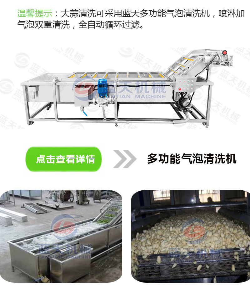 7、經(jīng)過(guò)脫皮的大蒜少不了會(huì)沾些灰塵或臟東西,可用氣泡清洗機(jī)將去皮后的大蒜們好好洗洗干凈,得保證要脫水的大蒜們干凈衛(wèi)生。