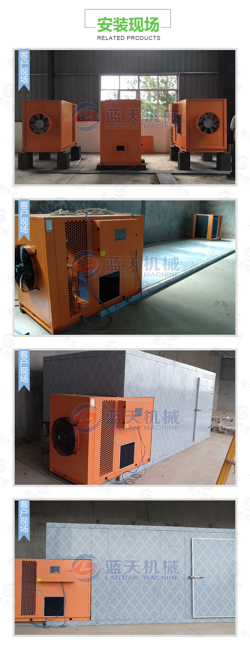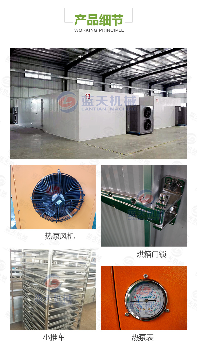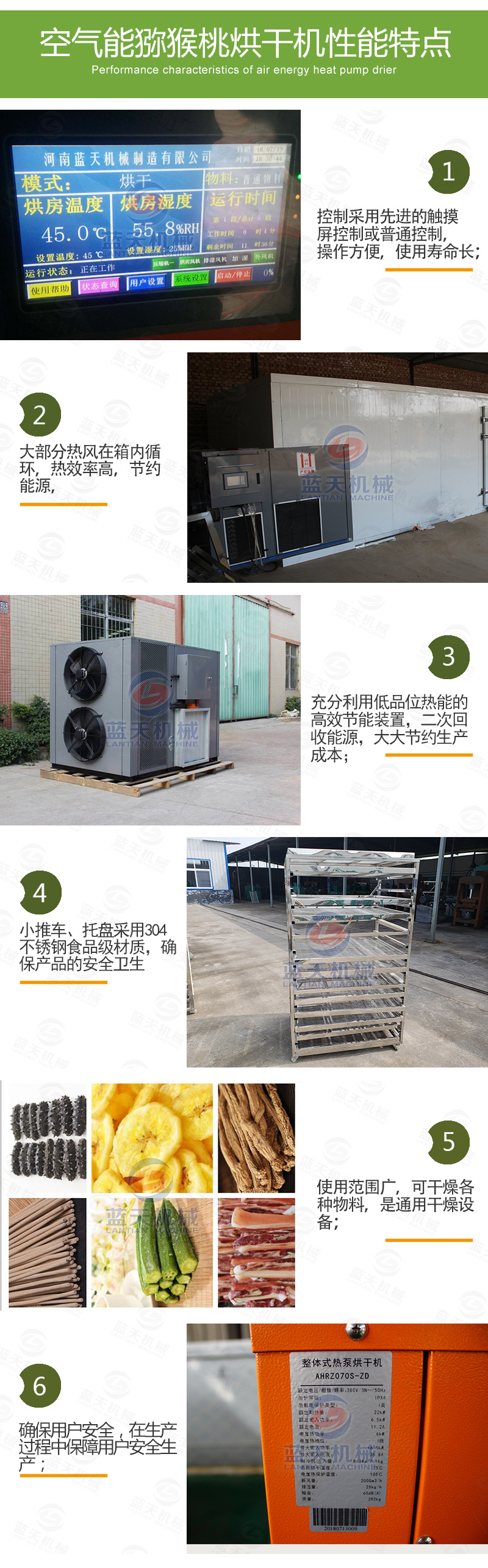 1.熱源空氣能熱泵機(jī)組。2.烘干機(jī)保溫房體。3.烘干機(jī)內(nèi)部熱風(fēng)循環(huán)裝置。4.自動(dòng)排濕裝置。5.溫濕度智能控制裝置。6.裝放獼猴桃干的物料小推車(chē)和物料托盤(pán)。