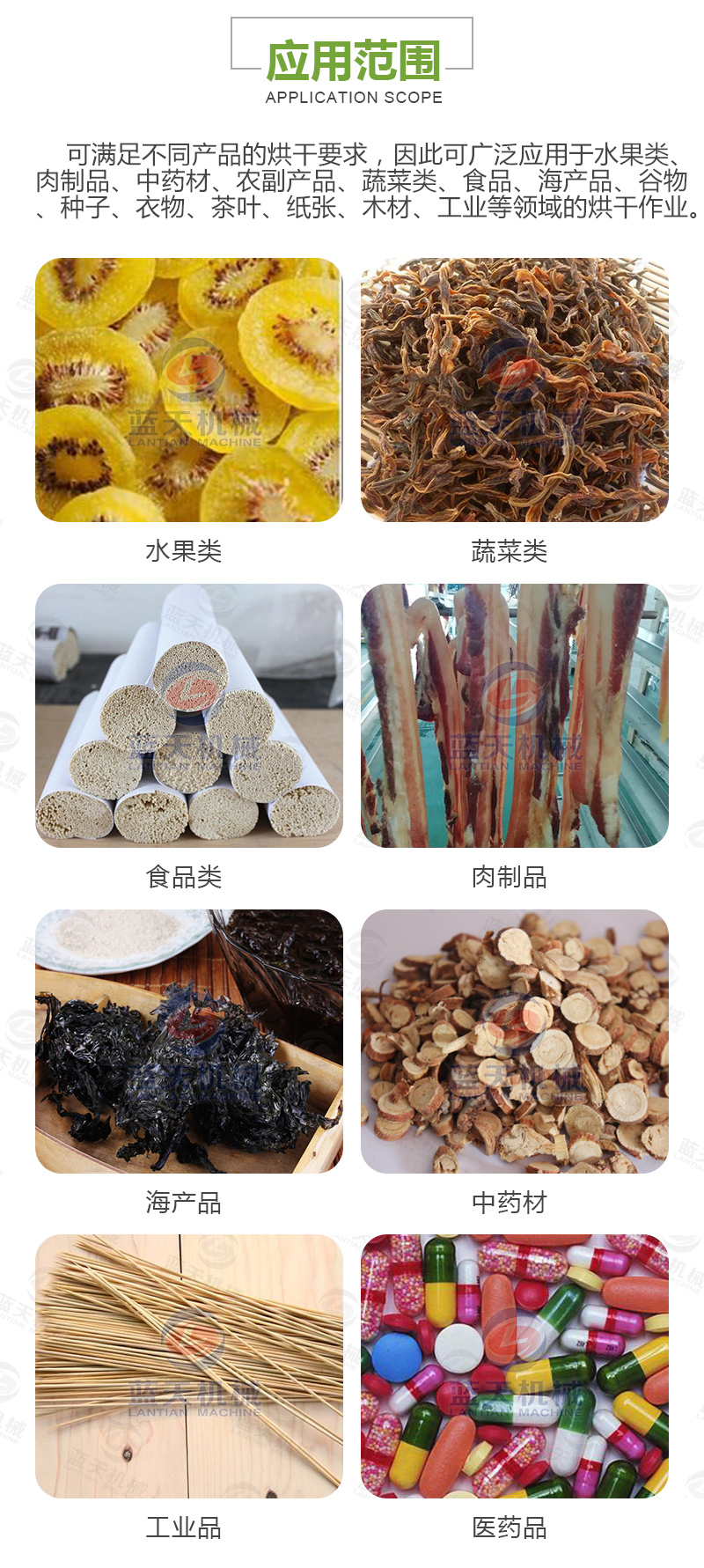 獼猴桃烘干機(jī)適用于:果蔬、果脯、肉制品、腸衣、煙葉、皮革、枸杞、烘干蔬菜類(lèi)(辣椒等),食品(面條、掛面等)