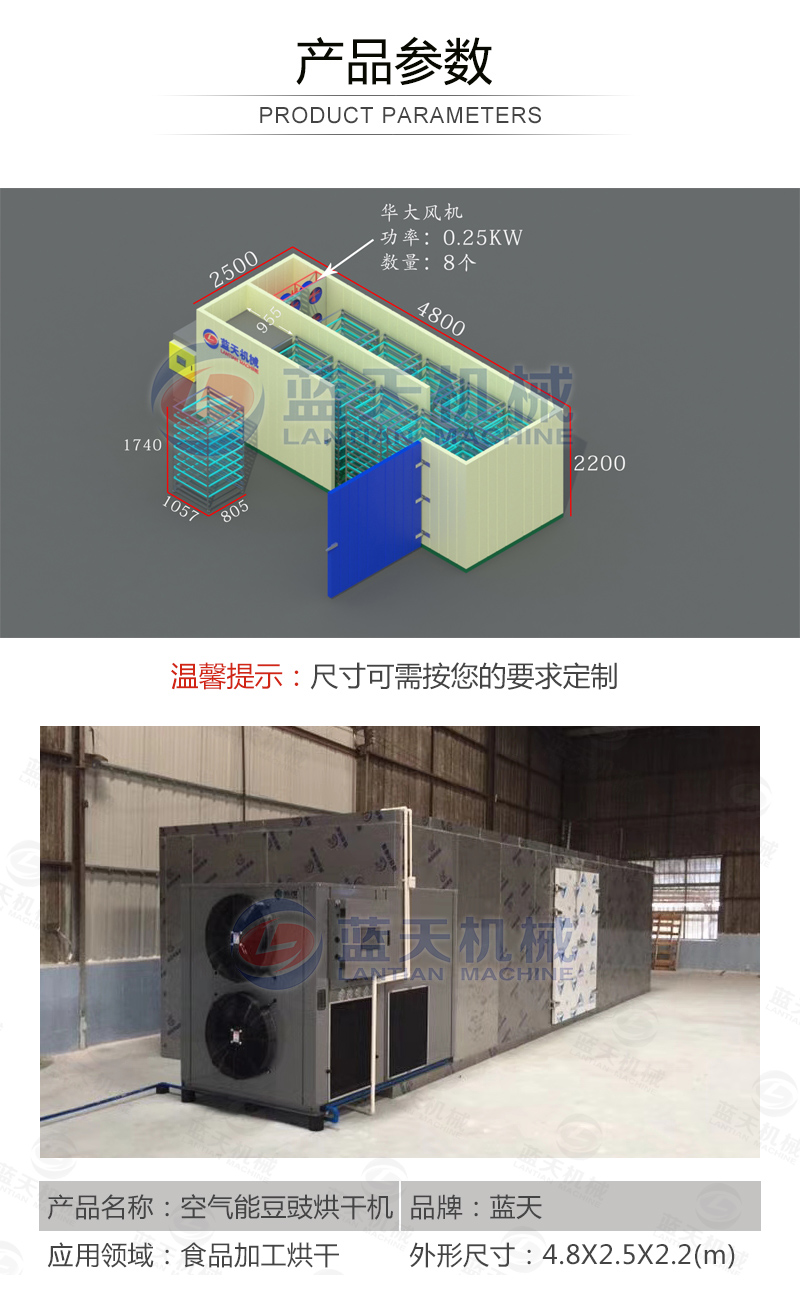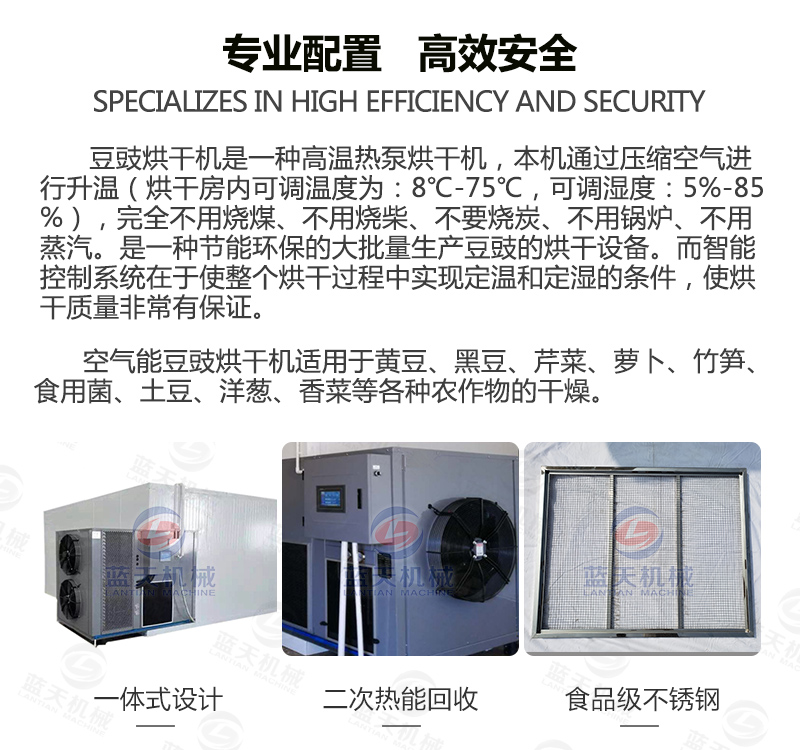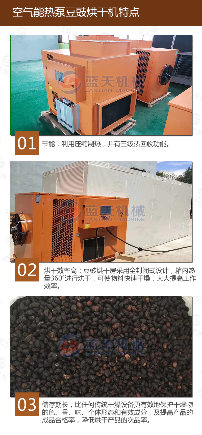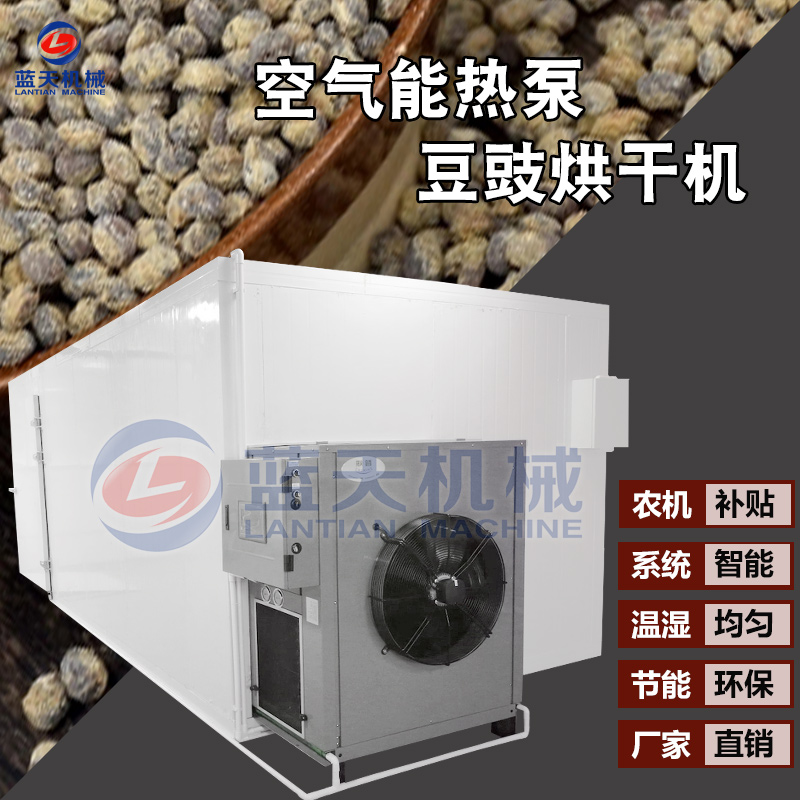 豆豉富含蛋白質(zhì)、各種氨基酸、乳酸、磷、鎂、鈣及多種維生素,色香味美,我國南北部都有加工食用。但若不注意加工藝,會致使品質(zhì)下降,甚至霉變,造成經(jīng)濟損失。傳統(tǒng)上使用太陽光曬制,但是生產(chǎn)效率低下,并且在曬制過程中極容易有污染,本文介紹使用一種基于空氣能熱泵技術(shù)的豆豉烘干設(shè)備,大大加快了豆豉的生產(chǎn)流程。