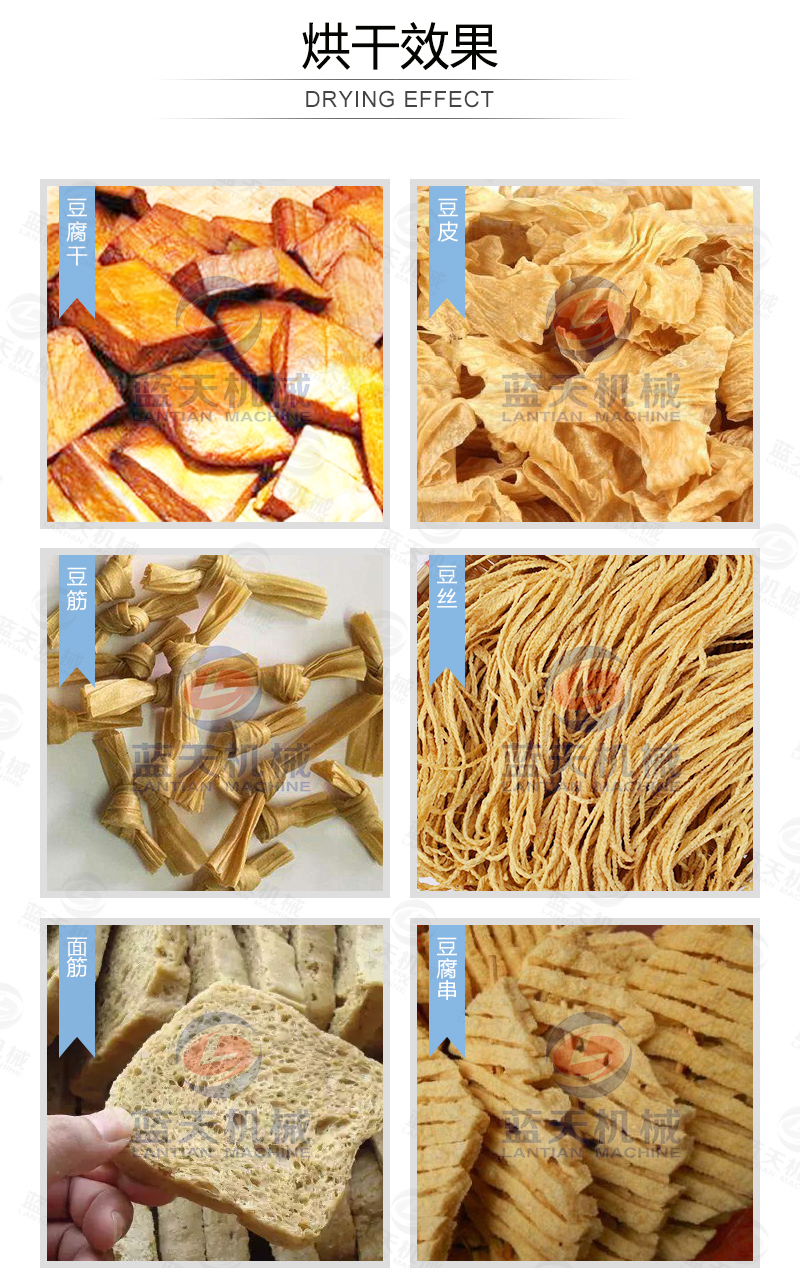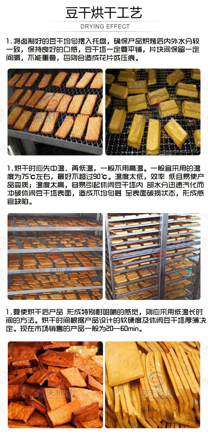 豆腐干坯要平鋪,片塊間保留適當(dāng)?shù)拈g隔,不能重疊,否則會造成花片或壓痕。豆腐干烘干時,豆腐干烘干設(shè)備應(yīng)先中溫、再低溫,一般不用高溫。一般豆腐干烘干機宜采用的溫度為85℃左右,不超過95℃。豆腐干烘干設(shè)備溫度太低,效率低且易使產(chǎn)品變質(zhì);溫度太高,容易引起豆干坯內(nèi)部水分迅速汽化而沖破豆干坯表面,造成不均勻甚至表面破損狀態(tài),形成感官缺陷。如果要使烘干后豆腐干形成特別耐咀嚼的感覺,豆腐干烘干機則應(yīng)采用低溫長時間的方法。豆腐干烘干時間根據(jù)豆腐干設(shè)計的軟硬度及休閑豆干坯厚薄決定。