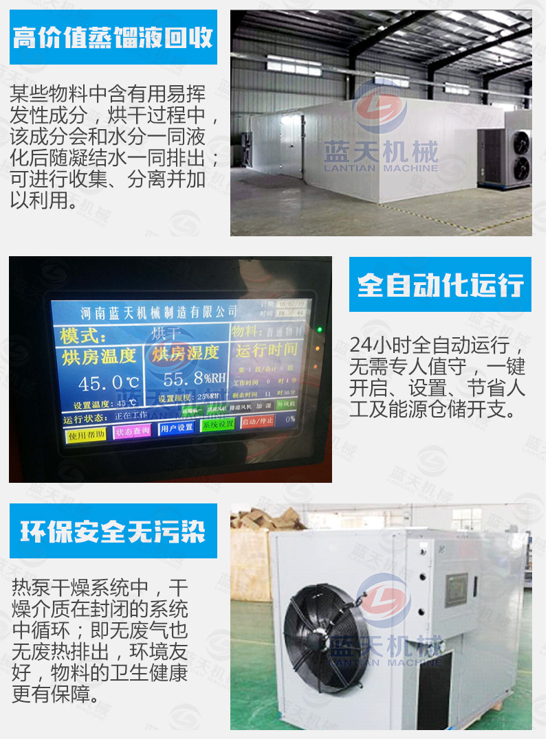 藍(lán)天海產(chǎn)品烘干機(jī)采用觸摸屏控制系統(tǒng),可實(shí)現(xiàn)多個(gè)時(shí)段曲線(xiàn)控溫,操作簡(jiǎn)單方便。海鮮烘干機(jī)吸收空氣的熱量并將其轉(zhuǎn)移到房?jī)?nèi),實(shí)現(xiàn)烘干機(jī)內(nèi)的溫度提高,配合相應(yīng)的除濕裝置實(shí)現(xiàn)海產(chǎn)品的烘干干燥。海產(chǎn)品烘干機(jī)設(shè)備由壓縮機(jī)-換熱器(內(nèi)機(jī))-節(jié)流器-吸熱器(外機(jī))-壓縮機(jī)等裝置構(gòu)成一個(gè)循環(huán)系統(tǒng)(主機(jī)+烘干機(jī))。冷媒在壓縮機(jī)的作用下在系統(tǒng)內(nèi)循環(huán)流動(dòng)。它在壓縮機(jī)內(nèi)完成氣態(tài)的升壓升溫過(guò)程(溫度高達(dá)115℃),它進(jìn)入內(nèi)機(jī)釋放出高溫?zé)崃考訜岷.a(chǎn)品烘干機(jī)內(nèi)空氣,同時(shí)自己被冷卻并轉(zhuǎn)化為流液態(tài),當(dāng)它運(yùn)行到外機(jī)后,液態(tài)迅速吸熱蒸發(fā)再次轉(zhuǎn)化為氣態(tài),同時(shí)溫度下降至零下20℃-30℃,這時(shí)吸熱器周邊的空氣就會(huì)源源不斷地將熱量傳遞給冷媒。冷媒不斷地循環(huán)就實(shí)現(xiàn)將空氣中的熱量搬運(yùn)到海鮮烘干機(jī)內(nèi)加熱機(jī)內(nèi)空氣溫度,從而實(shí)現(xiàn)能量的幾倍增長(zhǎng),消耗一度電產(chǎn)生的熱量相當(dāng)于傳統(tǒng)電熱絲的4倍以上,達(dá)到效率高節(jié)能的效果。