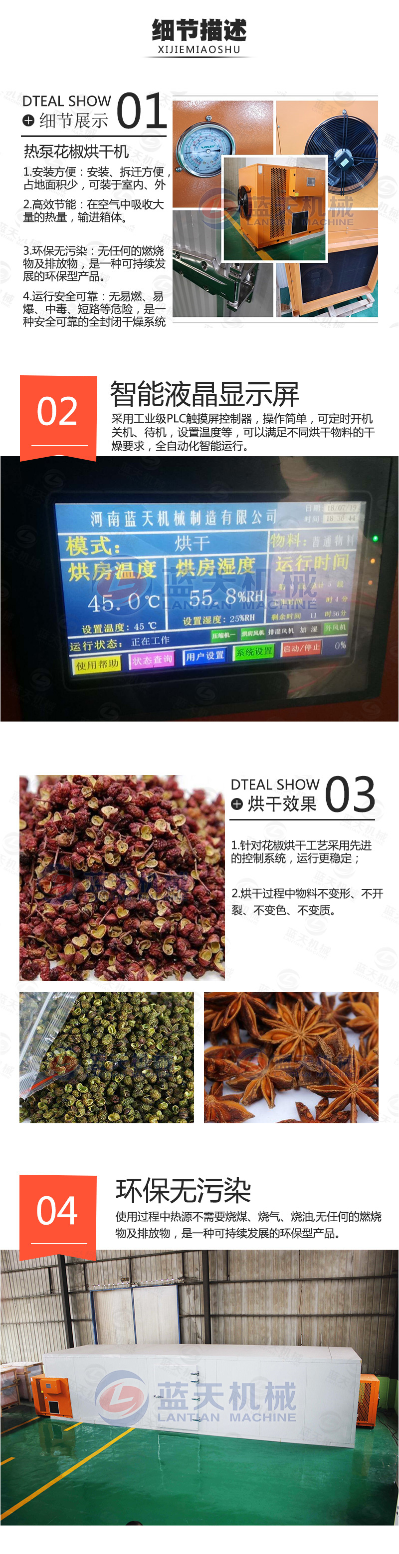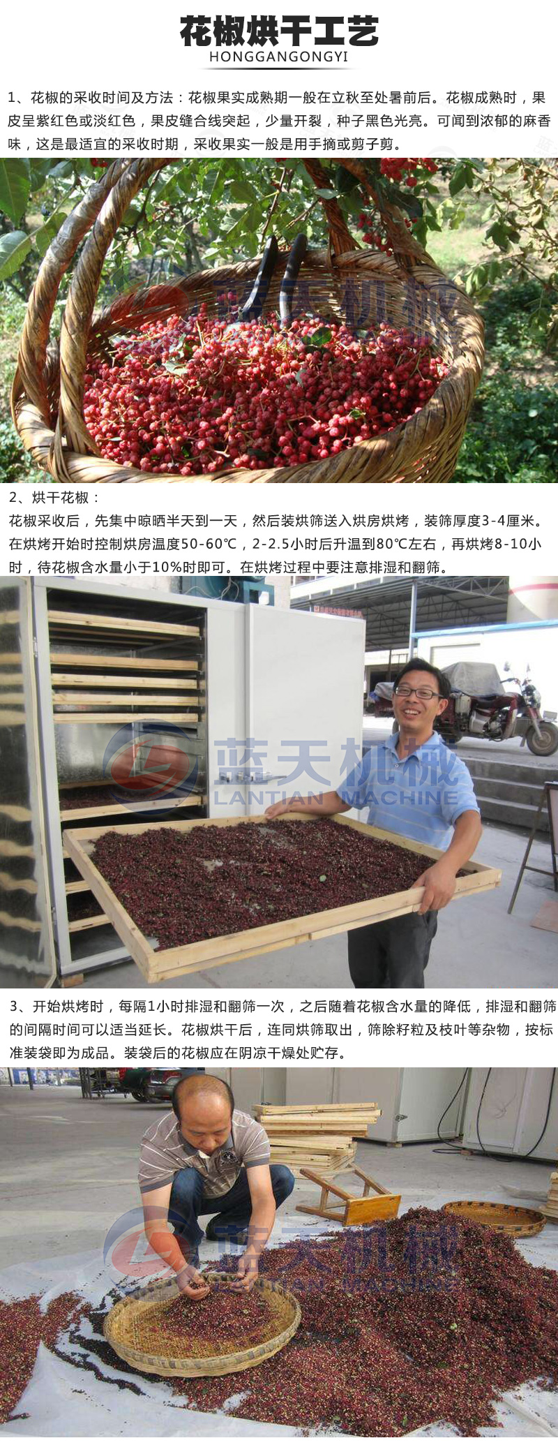三、晾曬工作晾曬對花椒品質(zhì)特別對色澤的影響較大,應(yīng)選晴朗天氣采摘,采摘的椒果要及時運回晾曬,當(dāng)天采收的椒果當(dāng)天晾曬,未曬干的,攤放在避雨通風(fēng)的地方。陰雨天露水過大的天氣不要采摘。目前我們可以采用花椒烘干機,從而快捷、經(jīng)濟地將剛采摘下來的花椒及時通過小型花椒烘干機烘干,保證花椒的色澤和品質(zhì)。但要特別注意溫度調(diào)節(jié)控制,以免影響種子的質(zhì)量。
