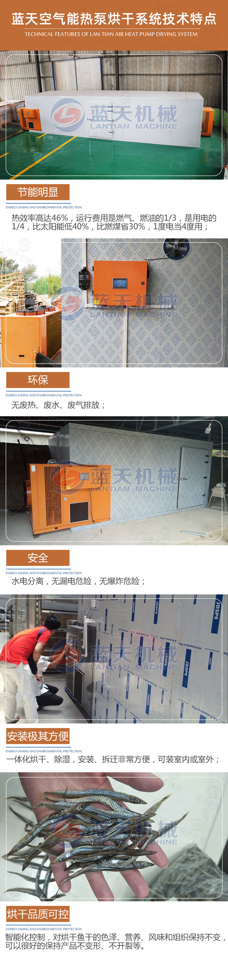魚(yú)干的種類(lèi)很多,將新鮮魚(yú)類(lèi)經(jīng)烘曬干制而成。海魚(yú)、淡水魚(yú)都可以制成魚(yú)干。脫脂魚(yú)干是以好的鮮魚(yú)為原料,經(jīng)過(guò)高溫蒸煮、烘干等程序精制而成,各項(xiàng)指標(biāo)均達(dá)到規(guī)定的標(biāo)準(zhǔn)。海魚(yú)相比淡水魚(yú)由于體積較小以及溫度要求可調(diào)范圍更大,所以海魚(yú)烘干質(zhì)量?jī)?yōu)先。除了傳統(tǒng)工藝,太陽(yáng)曬干,就是市面上烘干設(shè)備種類(lèi)較多,每種烘干設(shè)備都沒(méi)有一個(gè)標(biāo)準(zhǔn),烘烤出來(lái)的魚(yú)干色澤和營(yíng)養(yǎng)成分也參差不齊,如果采用煤鍋爐或者油鍋爐以及燒柴設(shè)備烘干,對(duì)于食品來(lái)說(shuō),很不衛(wèi)生,所以一直不能得以應(yīng)用。為解決魚(yú)干烘干上存在的各種問(wèn)題,空氣源熱泵魚(yú)干烘干機(jī)就出來(lái)了。
