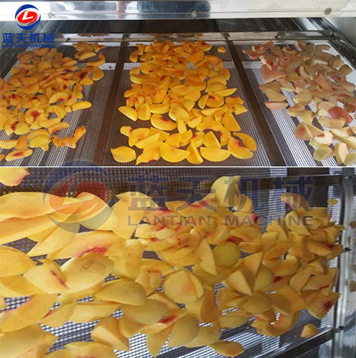 2、均勻切成小塊,放在黃桃烘干機的托盤上,配置的托盤材料是食品級別的,不會對黃桃造成污染。